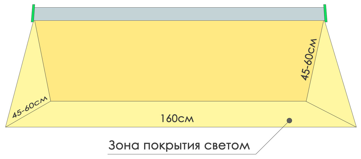 - Зона засветки лампы 140 см * 50 см. Максимальная высота подвеса 50-60 см