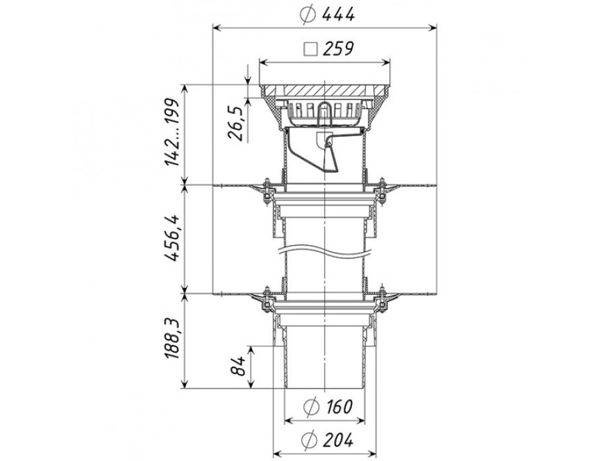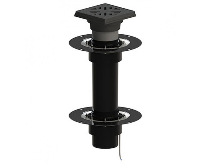 Двухуровневая кровельная воронка с трапом, прижимными фланцами из нержавеющей стали и дренажным кольцом, ТП-10.616-Э с электрообогревом
