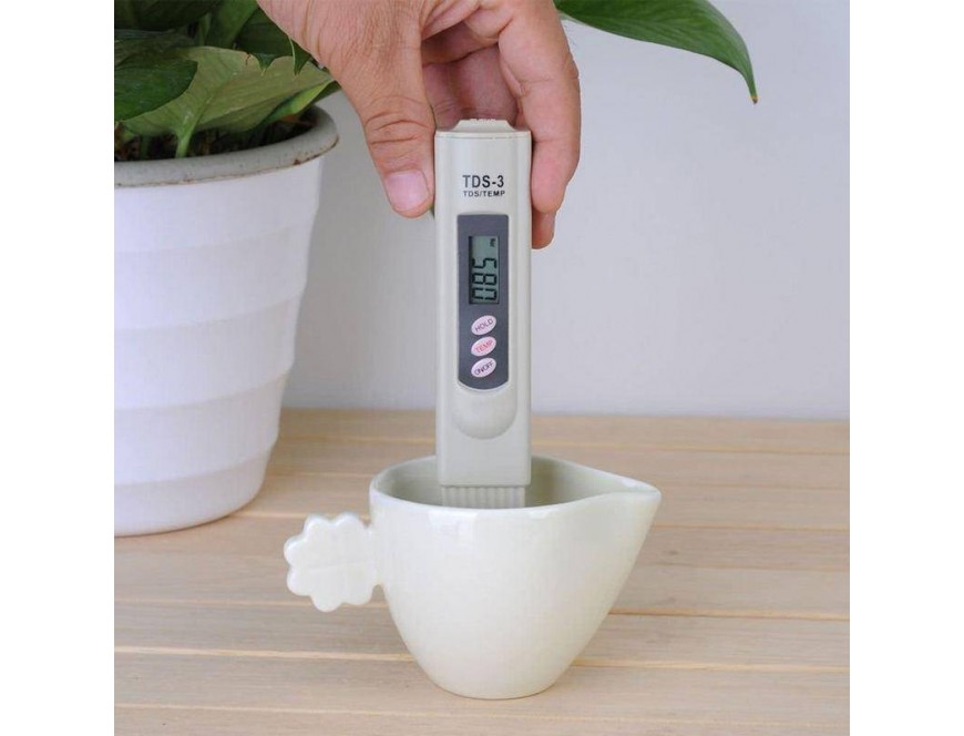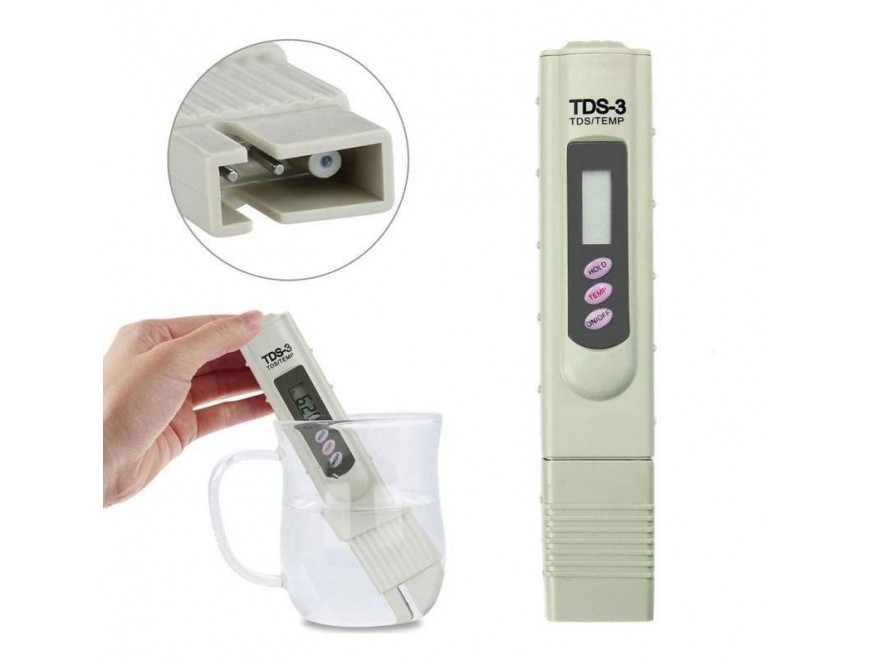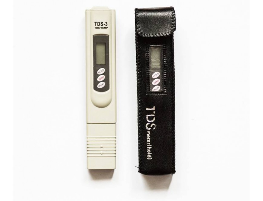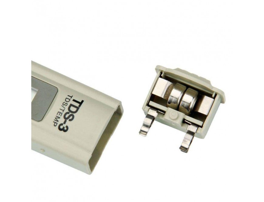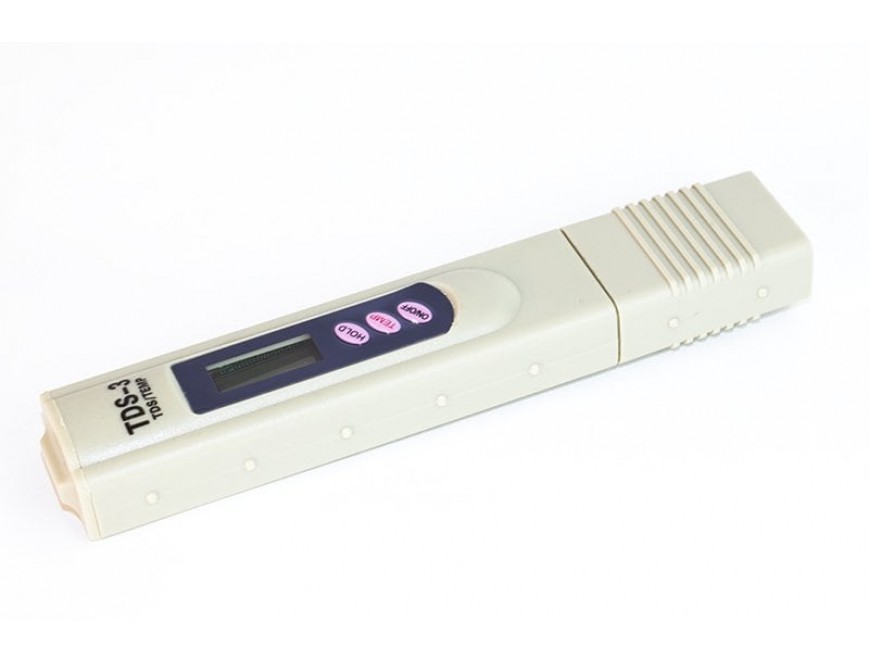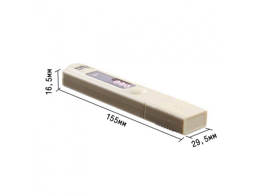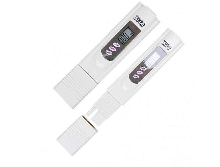 Переносной TDS метр предназначен для измерения общего уровня жесткости жидкости и ее температуры. TDS - total dissolved solids или общее количество растворенных веществ. Считается на один миллион частиц воды - ppm (parts per million). Собственно, в этих единицах и происходит измерение жесткости с погрешностью в 2% и диапазоном 0-9990 ppm.