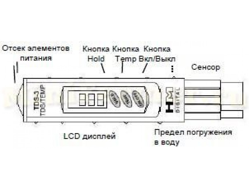 Внимание: так как TDS метр не герметичен, то его нельзя опускать в жидкость ниже установленного уровня.