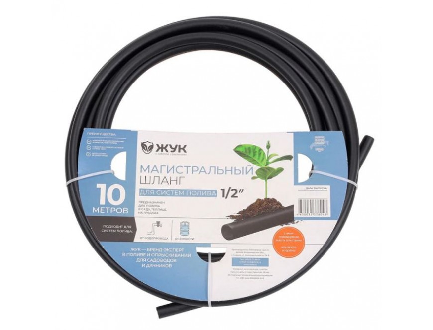 Шланг магистральный для капельного полива Жук 10 метров выполнен из прочного гибкого полиэтилена, что предотвращает перегиб шланга в процессе эксплуатации. Материал для шланга - чёрного цвета, стойкий к ультрафиолету, благодаря чему исключается зацветание воды в полостях шланга.