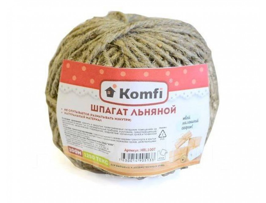 Льняной шпагат один из самых прочных среди натуральных шпагатов. Устойчив к солнечному и тепловому излучению. Идеально подойдет для проведения работ в саду и в сфере рукоделия.Обладает низкой электризуемостью, устойчив к солнечному и тепловому излучению. Экологически чист, благодаря натуральному происхождению. Льняное волокно – одно из самых плотных среди натуральных волокон. Не спутывается (разматывать изнутри). Цвет - Бурый Длина намотки - 100 м Диаметр поперечного сечения - 1,4 мм Плотность - 1250 текс Вид намотки - Бытовая Форма намотки - Клубок Торговая марка - Komfi.......