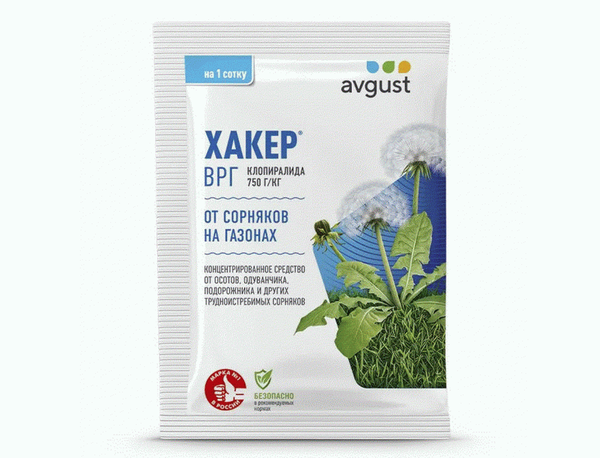 Содержит повышенную концентрацию действующего вещества и с легкостью уничтожает двудольные сорняки, такие как одуванчик, осоты, подорожник, щавель, лютик и другие, при этом не повреждает злаковую газонную траву. Препарат разводится в пропорции 2 г (одна упаковка) на 5 л воды, приготовленной жидкостью можно опрыскать 100 кв.м. газона. Обработки проводят после укоса, по участкам с проросшими сорняками. Поглощаясь листьями, Хакер переносится к точкам роста, корням и корневищам, нарушая процесс деления клеток и развитие растения. Через несколько дней листья сорняков скручиваются и желтеют, по истечении 1-3 недель наступает их окончательная гибель.