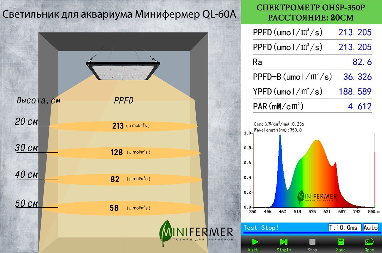 Универсальнй аквариумный светильник Минифермер QL-60A - это 44 шт белых светодиодов Samsung 4000K 281b+pro + 4шт красных светодиоды 660 нм 2835 идеально подходит для рыб и растений в вашем аквариуме.