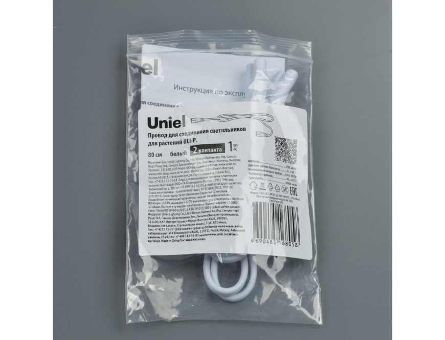Кабель соединительный для фитоламп UNIEL, FERON, UCX-PP2-L10-080 WHITE 1 POLYBAG ULI-P, 80см, 2 контакта, цвет белый